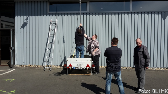Schon zum Aufbautag ist das bewährte Team aus F12 und F73 aktiv. Der Mast wurde aufgestellt, die Stationen vorbereitet und weitere Antennen auf dem Dach verspannt. Klaus, DG1FFD, hat wieder seinen Anhänger zur Verfügung gestellt und Marcel, DO4PPW, verspannt die Antennen mit. Die Ton- und Filmsysteme wurden schon weit vorher ausgepackt und eingerichtet, willkommen im Kamera-Wald. Die Klubstation gleich am Eingang wurde aufgebaut und die Morsepiepser auf Funktion getestet. OM Hans, DF5ZU, mit Frau waren überall mit zu Gange.